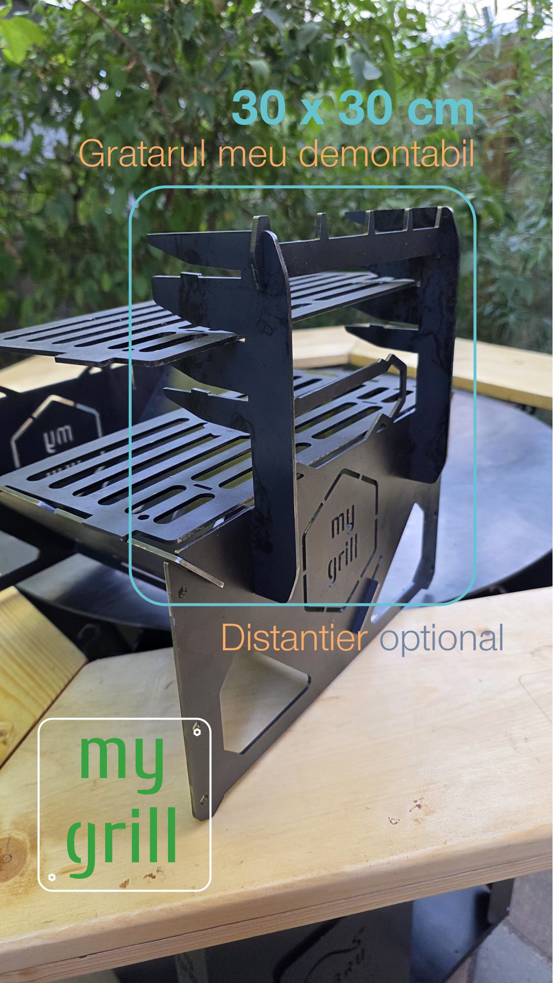 - Distanțier optional – depărtezi grătarul cat dorești faîă de jarul de cărbune sau ții mancarea caldă